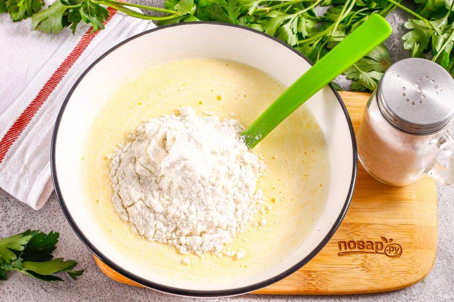 Всыпьте соль и тщательно взбейте масло с желтками, чтобы соль растворилась. Используя маргарин вместо масла, помните, что он и так соленый! Всыпьте пшеничную муку высшего сорта и замесите тесто.
