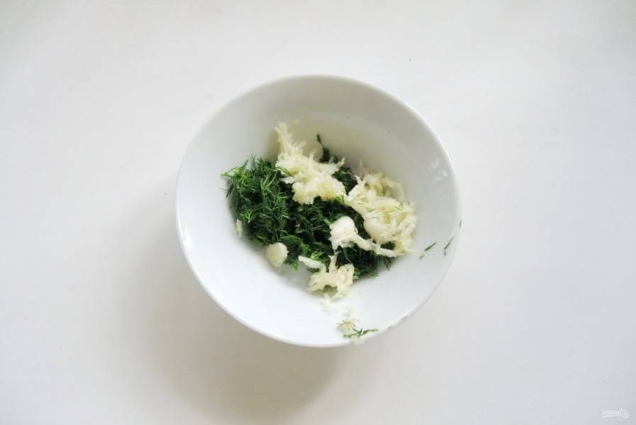Укроп помойте и мелко нарежьте. Чеснок очистите, измельчите. Соедините в миске и перемешайте.