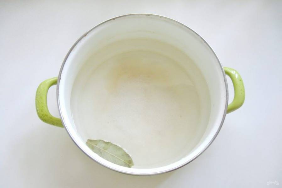 Опять приготовьте рассол, но уже из расчета на 1 литр воды 2 столовые ложки крупной соли. Добавьте лавровый лист. Доведите рассол до кипения.
