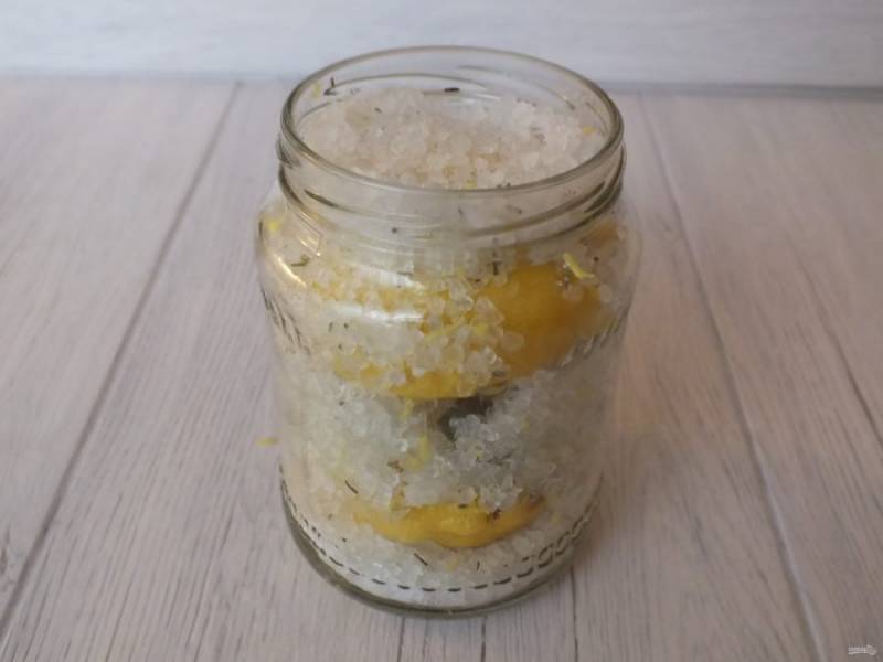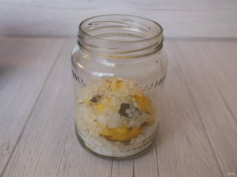 На дно чистой и сухой банки насыпьте пару столовых ложек соли, положите лимон, прижмите его слегка, насыпьте сверху еще соли.