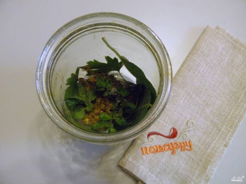 На дно каждой баночки положите по пару листочкой вишни, смородины, хрен, укроп и мяту. Баночки должны быть стерильными.
