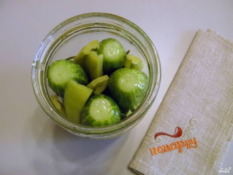 У огурчиков срежьте хвостики, уложите плотно в банки, вставьте болгарский перчик, порезанный полосочками.