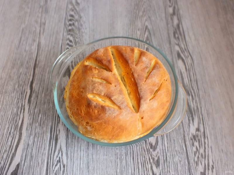 Возьмите круглую форму, смажьте тонким слоем растительного масла. Переложите в нее тесто. Сделайте глубокие надрезы и только теперь включите духовку на 180 градусов. Как только духовка прогреется, поставьте выпекаться хлеб на 35-45 минут. Ориентируйтесь на свою духовку!