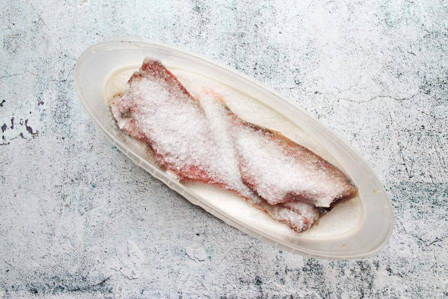 В тару, где будете солить рыбу, насыпьте на дно тонким слоем соль. Выложите рыбу в один слой и засыпьте оставшейся солью.