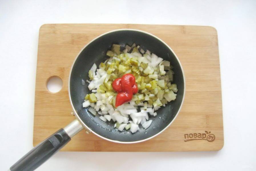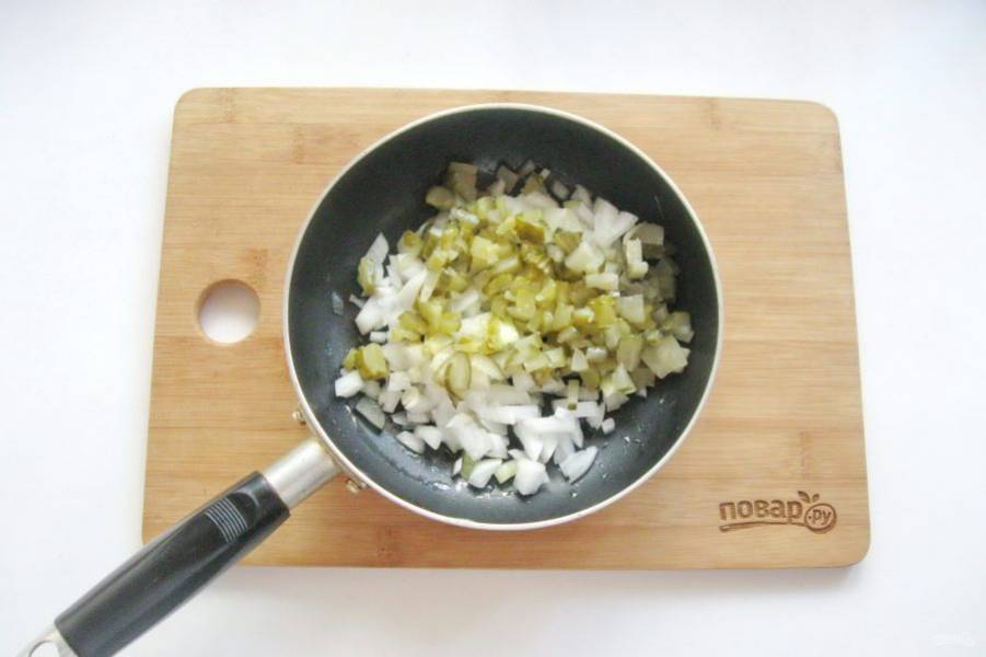 Соленый огурец натрите на терке или мелко нарежьте и добавьте к луку.
