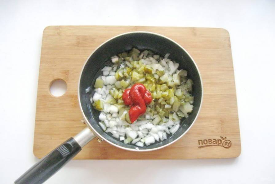 Накройте сковороду крышкой и тушите лук с огурцами и томатной пастой 10-12 минут до мягкости на небольшом огне.