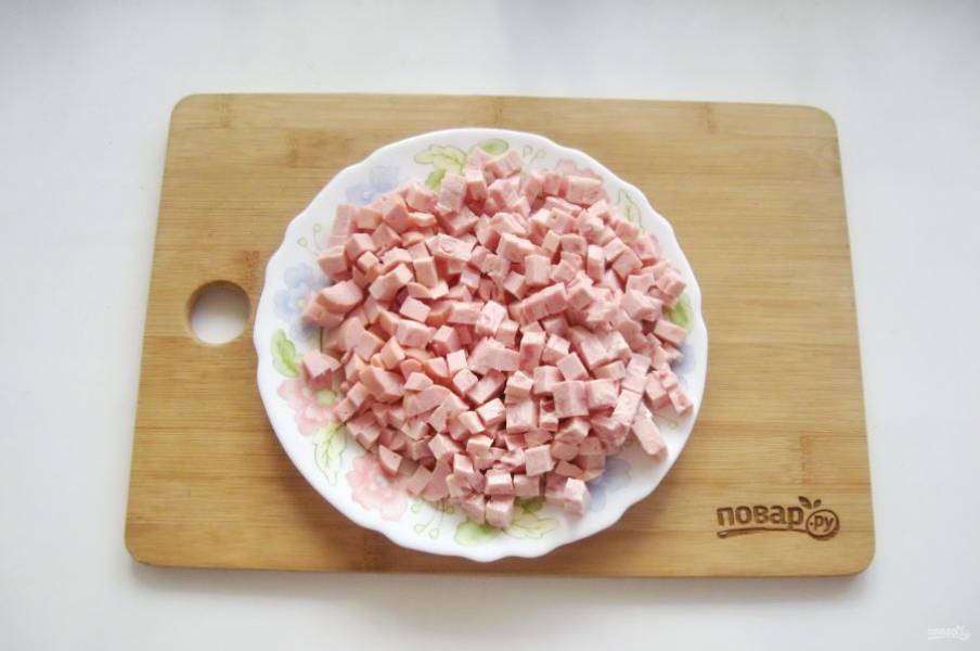 Тем временем нарежьте мелкими кубиками ветчину и вареную колбасу.