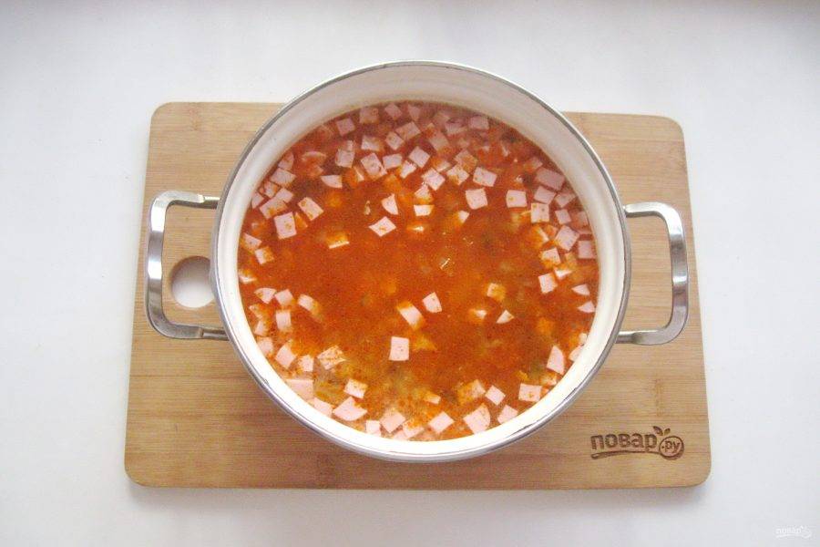 Нарезанные мясные изделия выложите в кастрюлю с куриным бульоном.