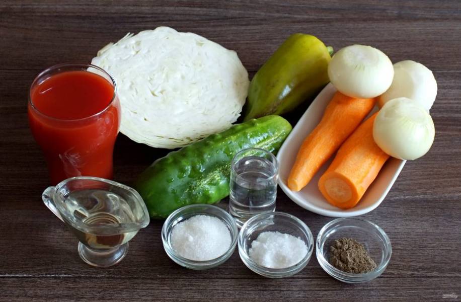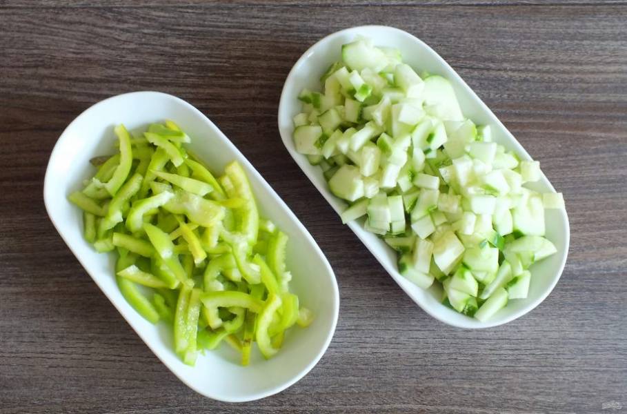 Очистите огурец от кожицы и нарежьте небольшими кубиками. Болгарский перец очистите от семян и нарежьте средней соломкой.