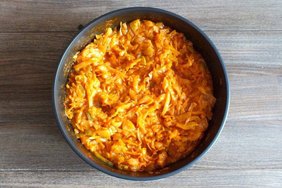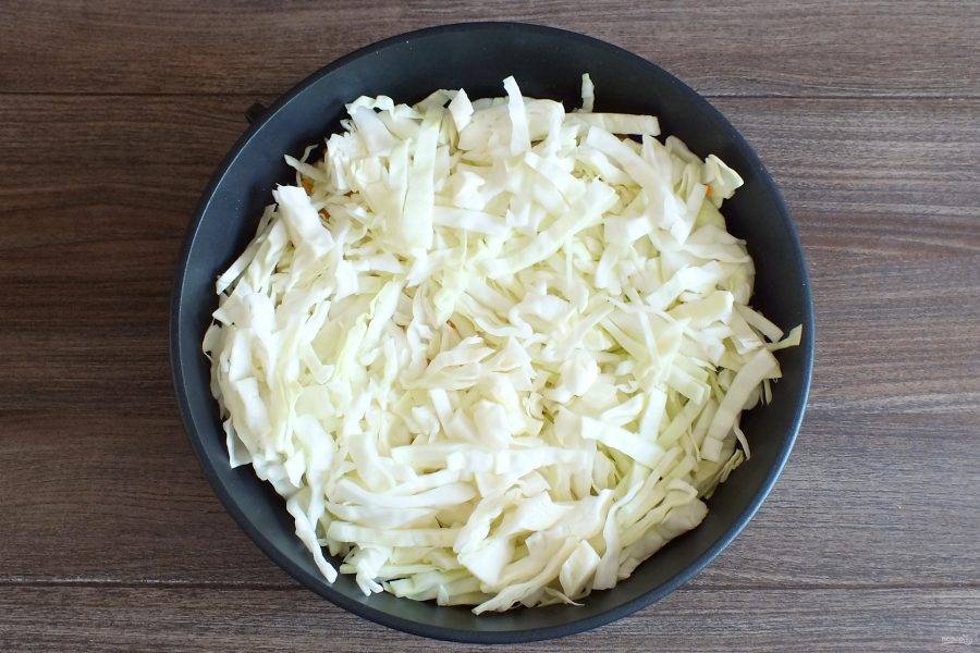 По истечение времени добавьте нарезанную капусту. Обжаривайте в течение 10 минут, периодически помешивая.