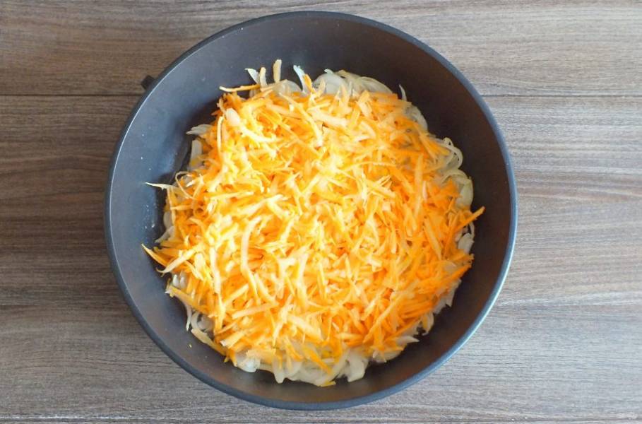 Когда лук станет прозрачным, добавьте к нему натёртую морковь. Перемешайте и обжаривайте всё вместе, периодически помешивая, в течение 7 минут.