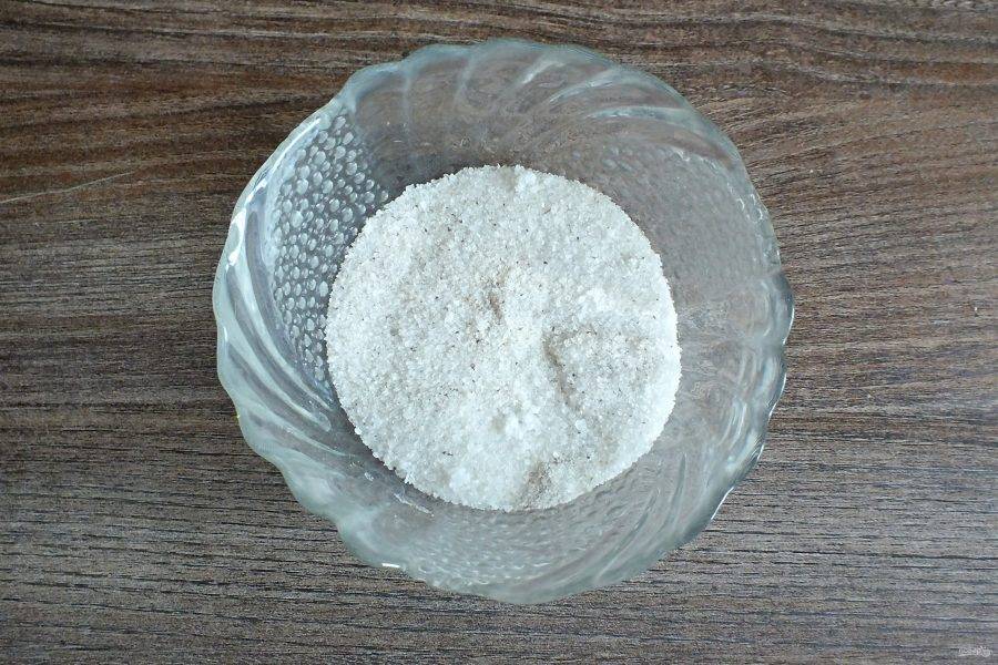Смешайте в чаше соль, сахар и черный молотый перец.
