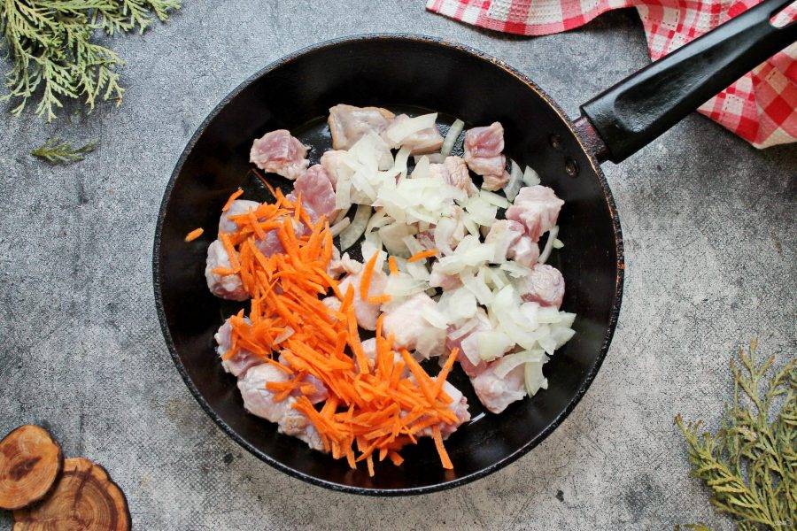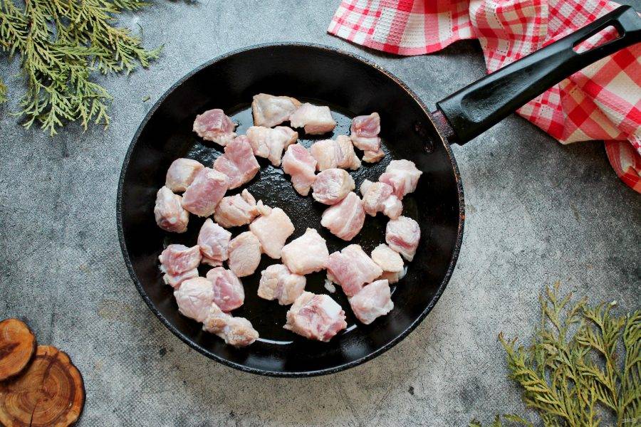 Свиную грудинку сполосните, обсушите и порежьте на кусочки. Сковороду нагрейте на среднем огне и выложите мясо.