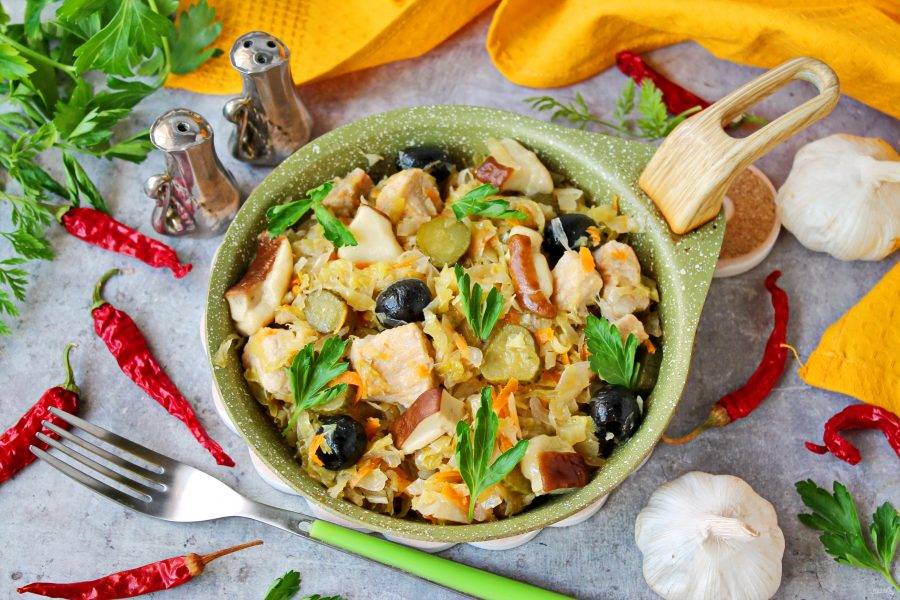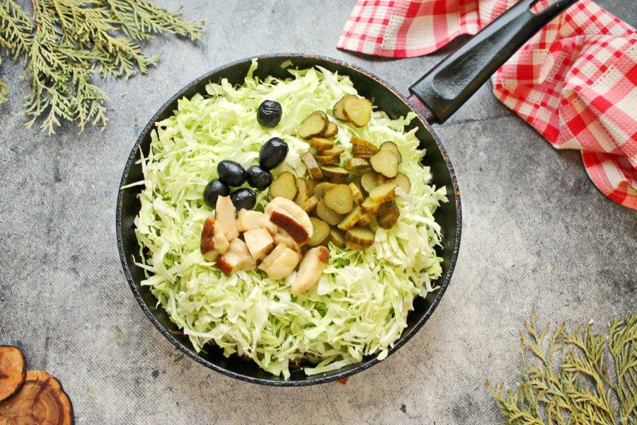 Положите белокочанную капусту, лавровый лист, маринованные грибы, маслины и резаные огурцы. Все перемешайте и тушите до готовности овощей, примерно 10-15 минут.