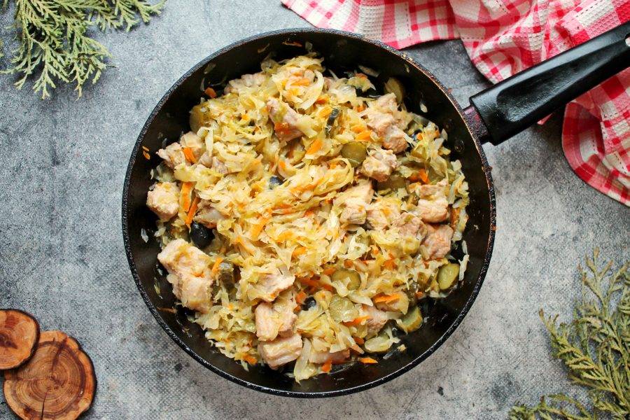 Добавьте квашеную капусту и тушите в течение 10 минут, перемешивая.