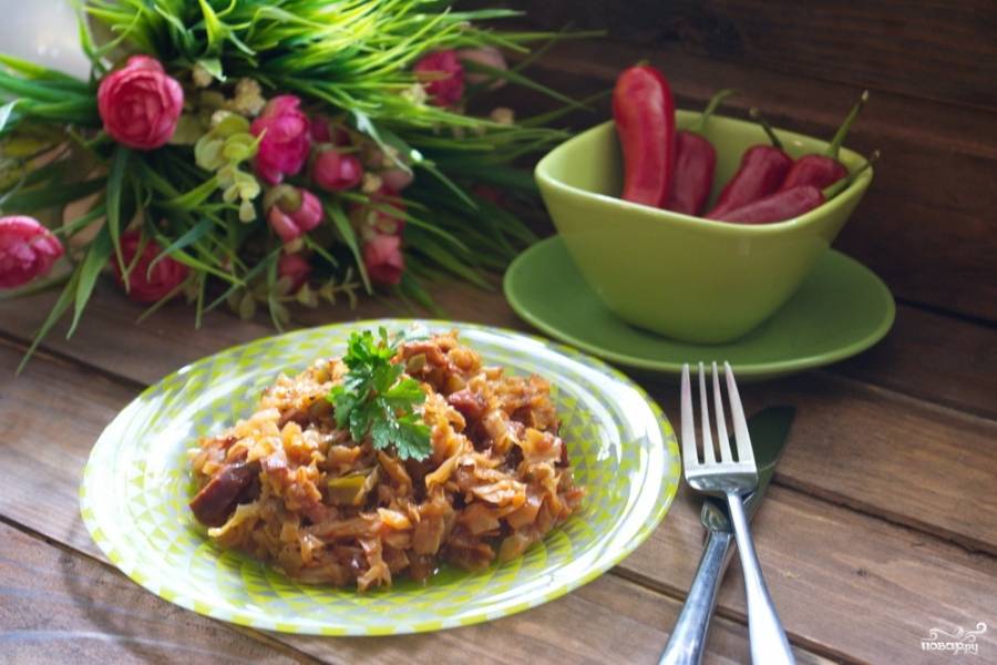 Накройте сковороду крышкой, тушите еще 20 минут. Можно подлить немного воды при тушении. Когда капуста станет мягкой и уменьшиться в объеме, добавьте нарезанные или натертые на терке соленые огурчики, жидкую сырую аджику. Тушите, перемешивая до готовности капусты.