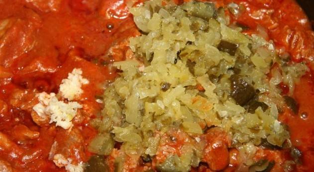 Добавит чеснок, огурцы и специи. Переключить на программу "тушение" на час.
