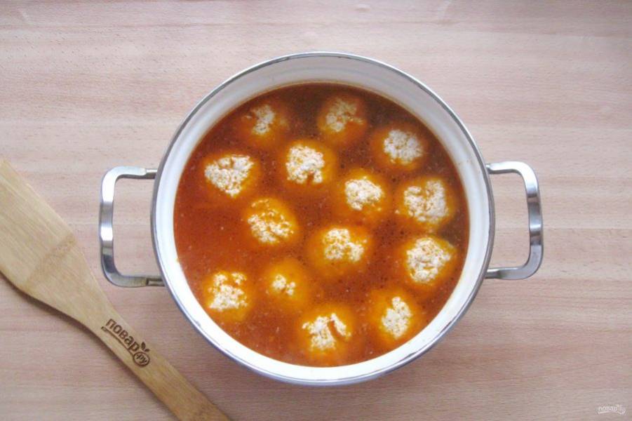 После выложите лук с огурцом и томатной пастой в кастрюлю с фрикадельками.
