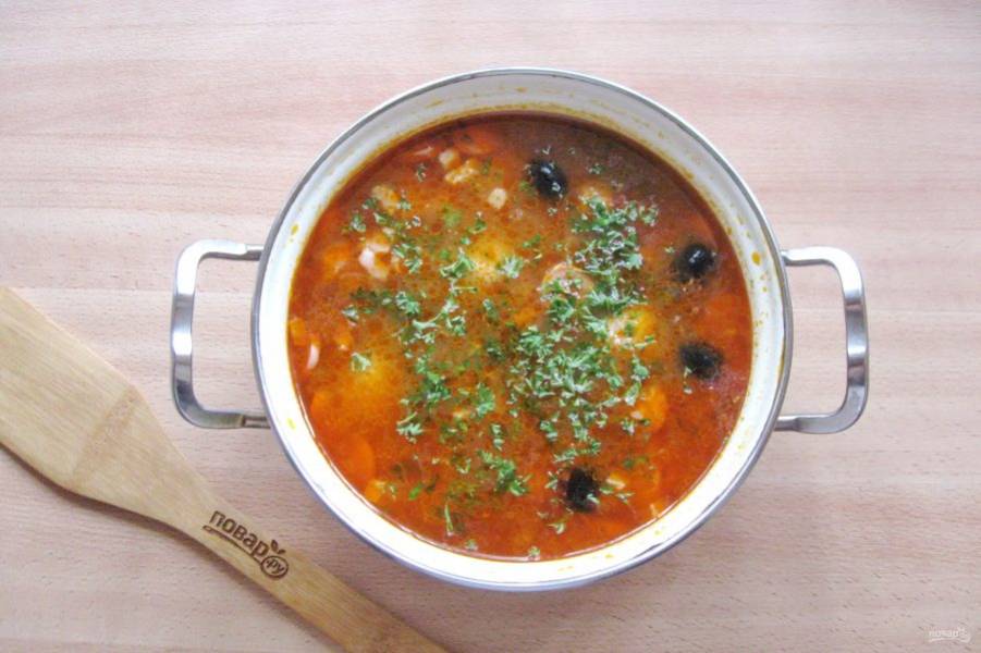 Варите солянку 10 минут и выключайте. В конце приготовления выложите маслины без косточек.