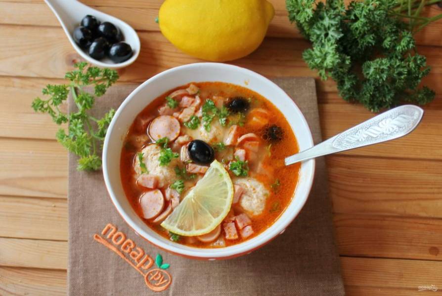 Солянка с фрикадельками готова. При подаче в каждую тарелку добавьте ломтик лимона и сметану по желанию.