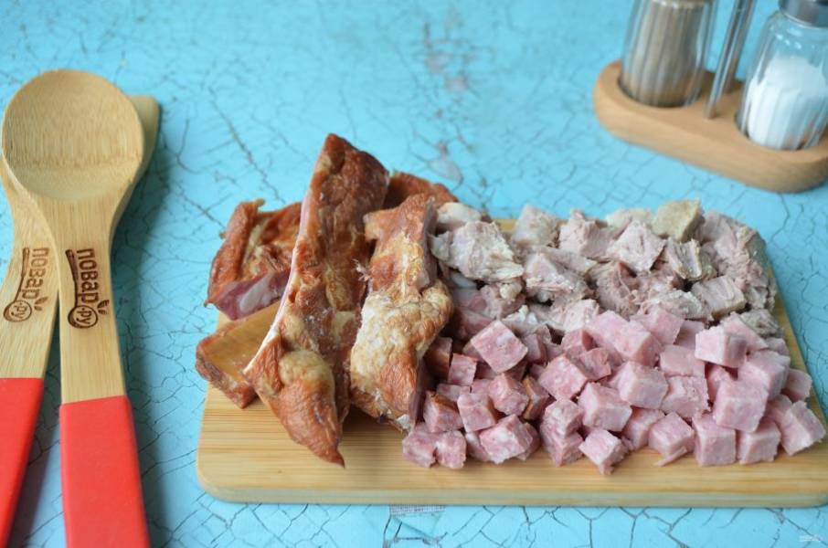 5. Порежьте ребра по мясной прослойке вдоль, остальные мясные продукты кубиками, включая мясо вареное.