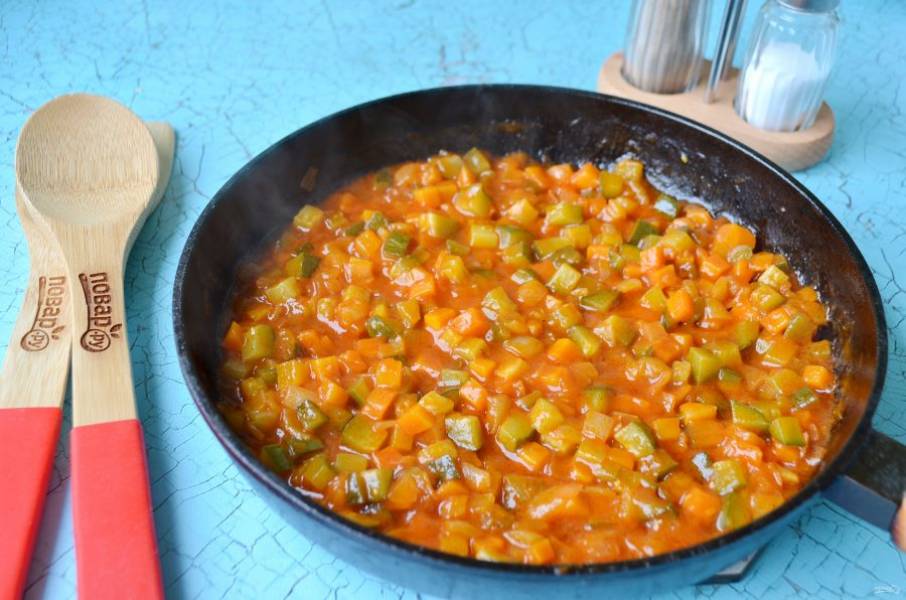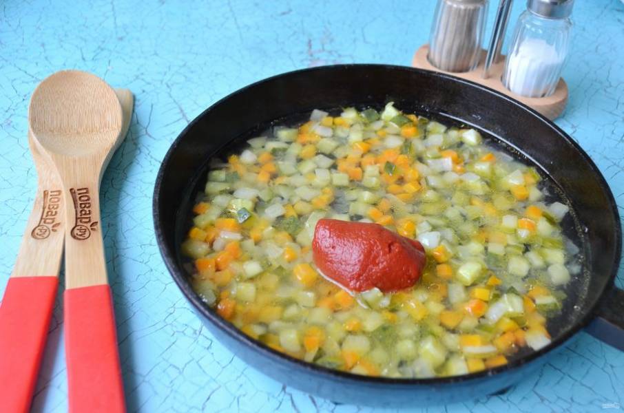 3. Положите томатную пасту, добавьте стакан бульона мясного и тушите зажарку до готовности моркови.