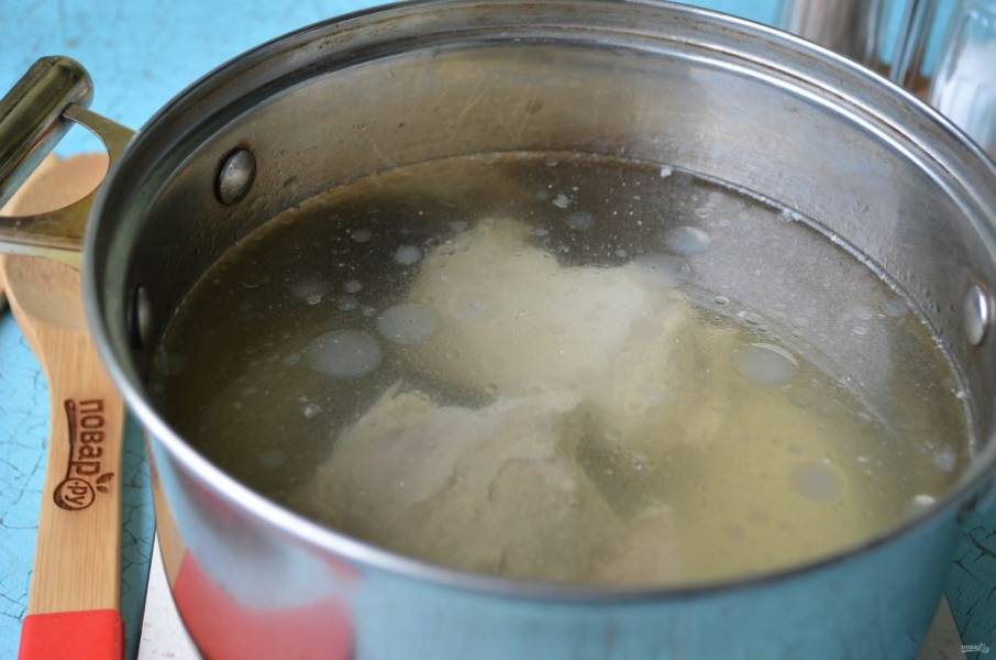 1. Для солянки нужно сначала сварить мясной бульон и мясо. Вымойте мясо, положите его в кастрюлю, залейте холодной водой и доведите до кипения, проварите 5-10 минут, слейте всю воду, ополосните кастрюлю. Залейте мясо свежей водой, положите целую луковицу и варите 1,5 часа до готовности мяса. В конце варки, минут за 15 положите лавровый лист, пару горошин душистого перца. Готовый бульон отцедите, отдельно положите остывать мясо.