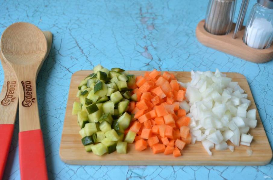 2. Порежьте лук, морковь и огурцы кубиками. Обжарьте на растительном масле сначала лук, потом через пару минут положите морковь, и через пару минут огурчики. Жарьте еще минут 5.