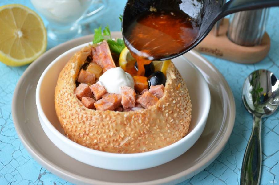 Солянка с копченостями в хлебе