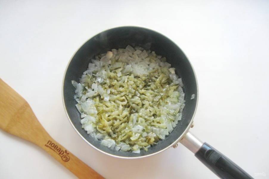 Репчатый лук и соленый огурец мелко нарежьте. Выложите в сковороду.