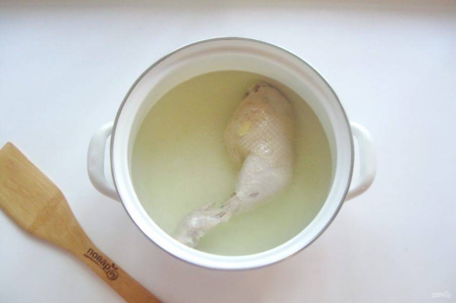 Доведите до кипения, огонь убавьте, пену снимите и варите окорочок до готовности. Окорочок достаньте из бульона.