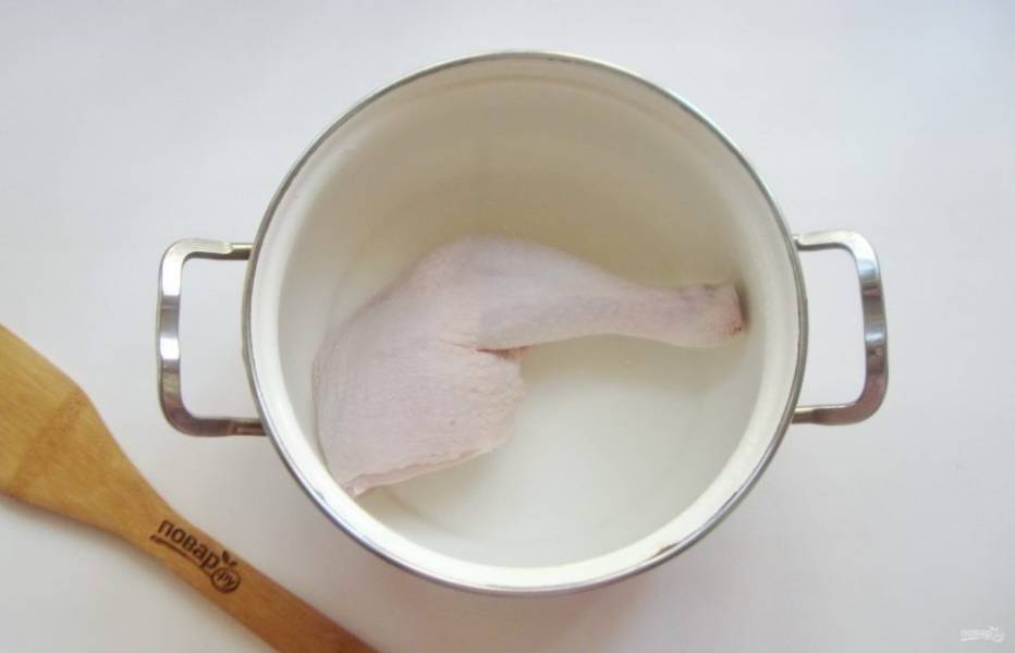 Куриный окорочок помойте и выложите в кастрюлю с водой.