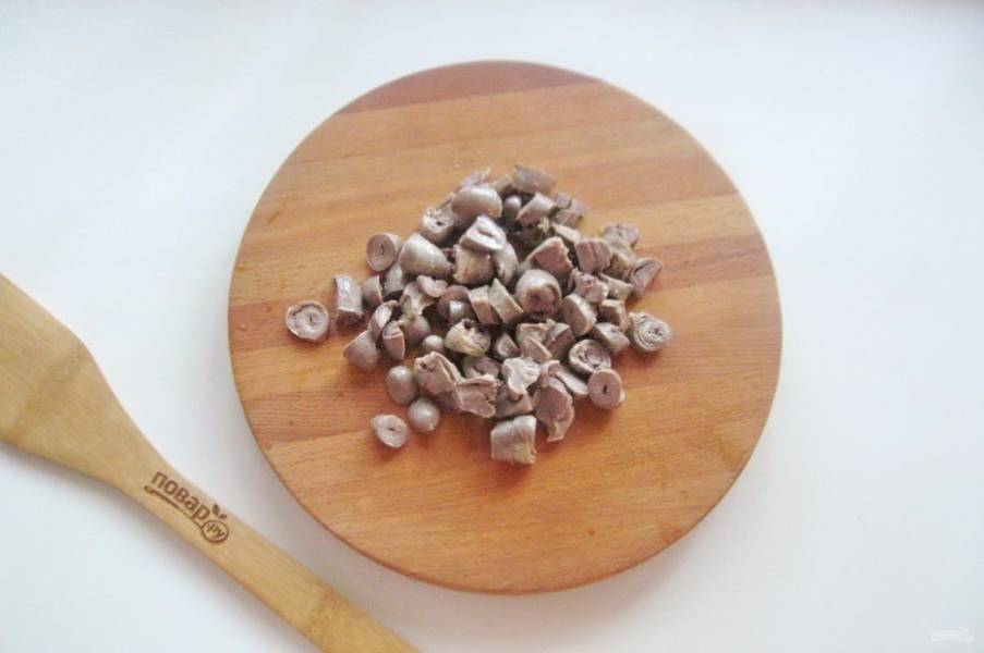 Вареные сердечки мелко нарежьте.
