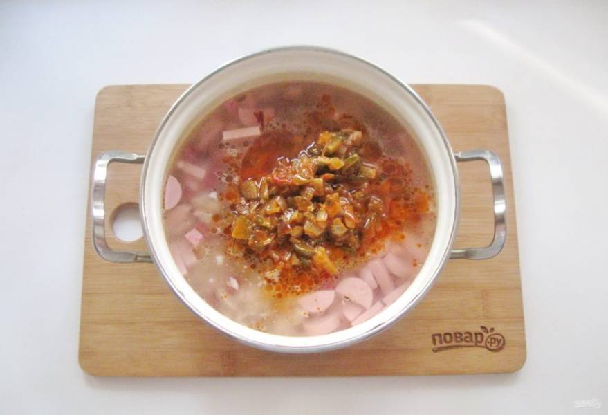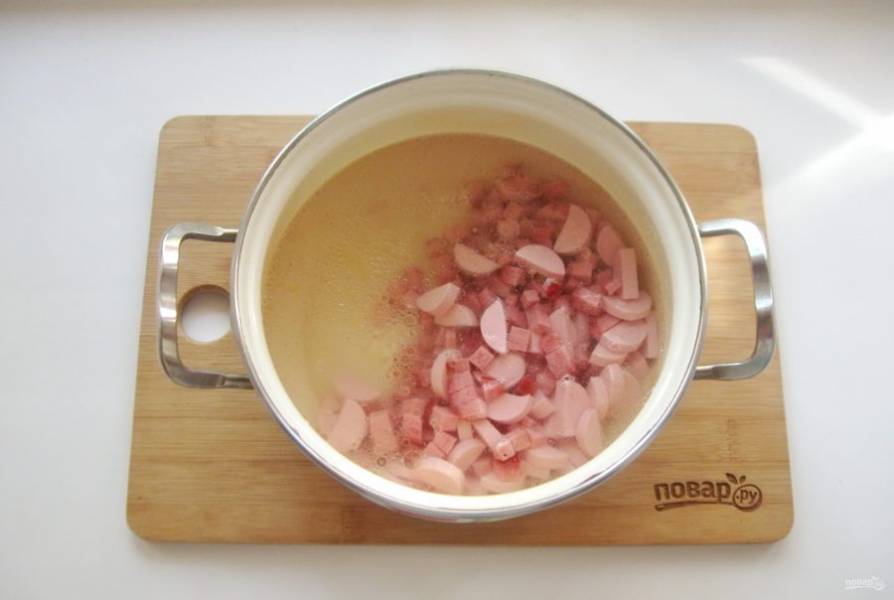 Пока огурец с луком тушатся, займитесь колбасой. Нарежьте сосиски и полукопченую колбасу.