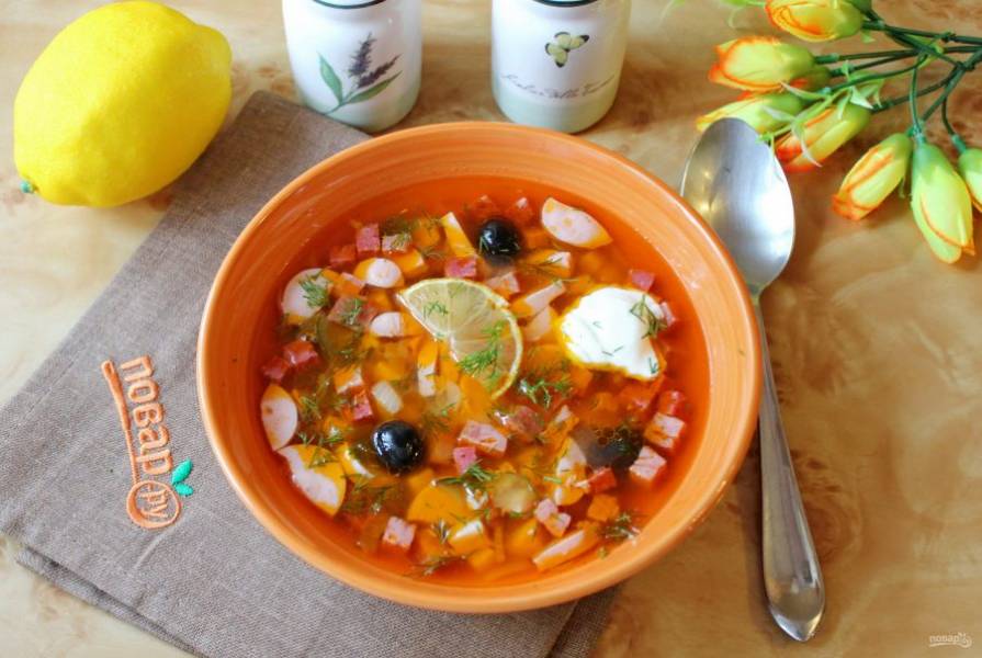 Солянка с огуречным рассолом готова. При подаче в каждую тарелку выложите ломтик лимона.
