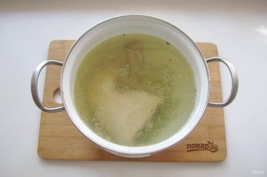 Сварите курицу. Для этого выложите окорочок в кастрюлю. Залейте водой и доведите до кипения. После огонь убавьте и снимите пену.