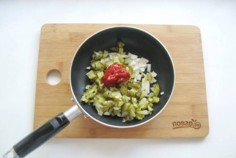 Добавьте мелко нарезанный и натертый на терке соленый огурец.