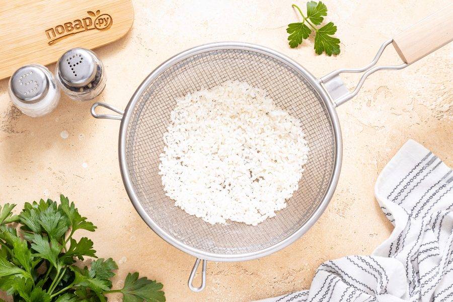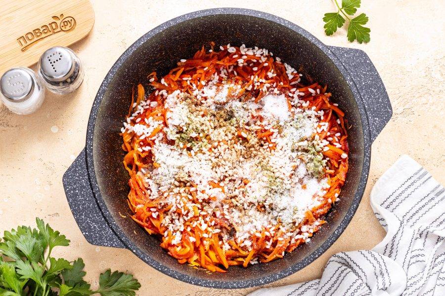 Добавьте рис. Посолите и поперчите, добавьте сахар, сушеную петрушку и пропущенный через пресс зубчик чеснока.