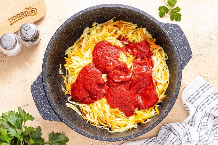 Влейте протертые томаты и потушите все вместе 5-10 минут.