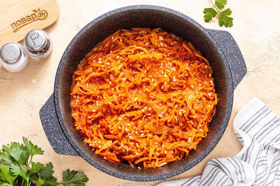 Все перемешайте и тушите около 20 минут до готовности риса. Если будет казаться, что мало жидкости, то подлейте горячей воды. В конце добавьте уксус, потушите еще 1 минуту и снимайте с плиты.