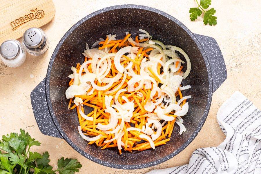 Разогрейте глубокую сковороду или кастрюлю с толстым дном, влейте растительное масло. Обжарьте репчатый лук с морковью до мягкости и золотистого цвета.