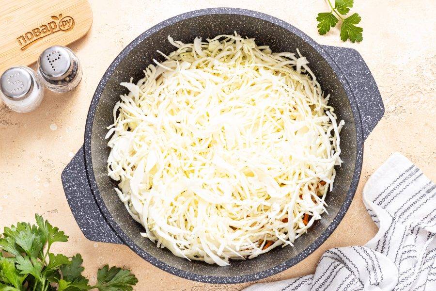 Добавьте капусту и обжаривайте еще 5-7 минут, пока капуста не уменьшится в объеме.
