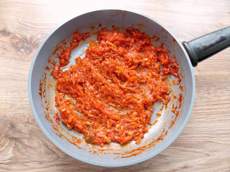 Добавьте в сковороду с луком томатную пасту и обжаривайте на медленном огне в течение 7 минут перемешивая.