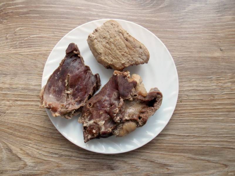 В кастрюлю налейте воду, выложите говяжье сердце. Варите его в течение одного часа на медленном огне после закипания, снимая пену. Затем добавьте свинину и варите еще 30 минут. Затем извлеките мясо с сердцем, а бульон процедите. Поставьте снова на огонь.