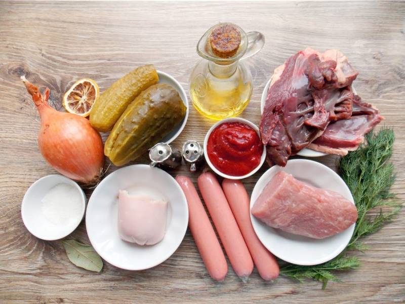 Подготовьте все необходимые ингредиенты для приготовления солянки с сердцем.