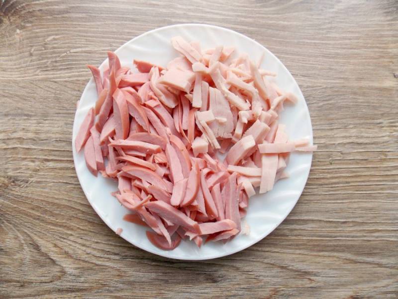 Очистите сосиски от оболочки. Порежьте сосиски и ветчину соломкой, добавьте в кастрюлю с сердцем и мясом.