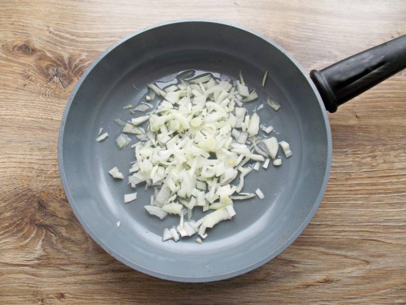Лук очистите, сполосните, порежьте. В сковороду налейте масло и выложите порезанный лук.