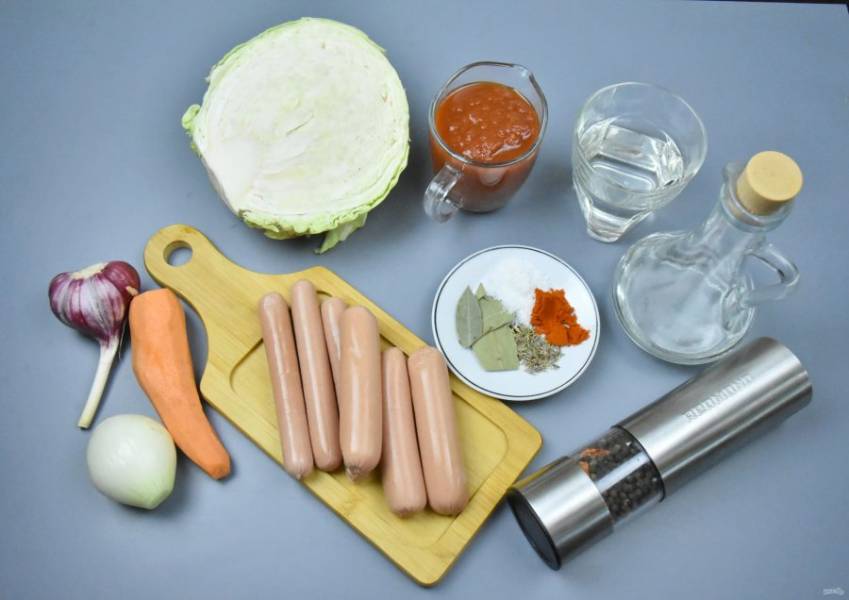 Для приготовления солянки с сосисками подготовьте продукты. Можно использовать любые виды сосисок. Для придания пикантного дымного вкуса можно добавить охотничьи сосиски из копченого мяса или сосиски с добавлением твердых сортов сыра. Для более легкого варианта возьмите сосиски из мяса птицы или на основе сои.