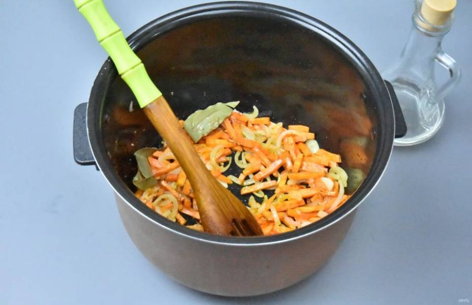 Установите чашу в мультиварку и подключите устройство к сети. В режиме меню выберите программу «Жарка». Автоматически установится время 15 минут. Включите кнопку «Старт». Обжарьте овощи, периодически их помешивая. Добавьте лавровый лист, соль, черный молотый перец, паприку, тимьян. По желанию можно всыпать щепотку острого красного перца.