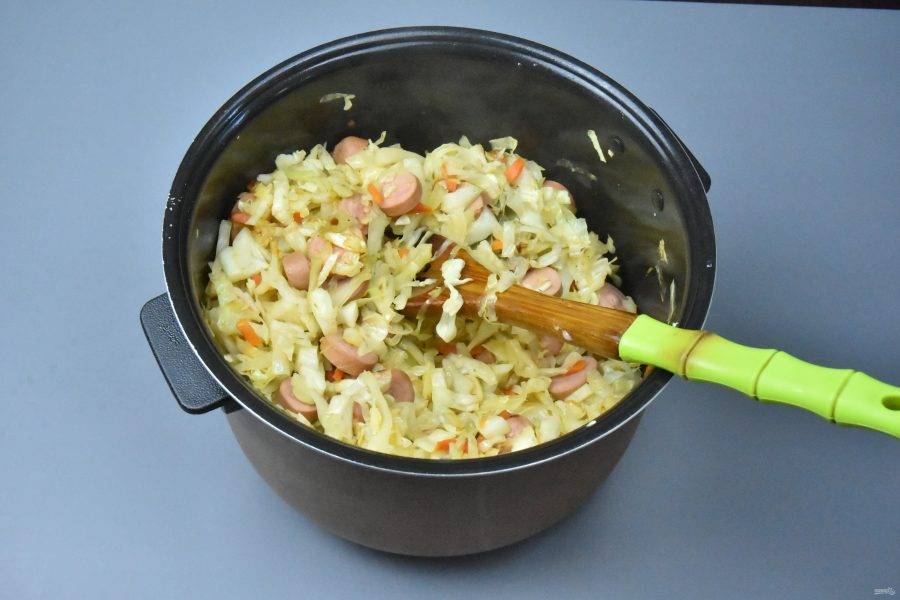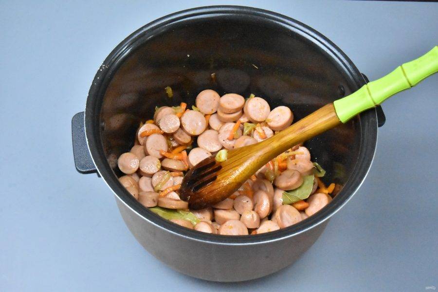 К обжаренным овощам добавьте сосиски, перемешайте и дайте им слегка подрумяниться.